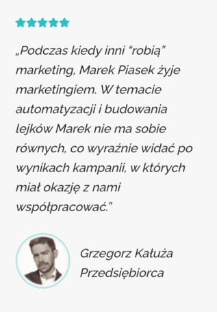 Nazywam się Marek Piasek. Nie jestem nauczycielem. Jestem przedsiębiorcą, który zakochał się w możliwościach, jakie dają lejki marketingowo - sprzedażowe w połączeniu z płatną reklamą na Facebooku, Instagramie, YouTubie, Google, LinkedIn.